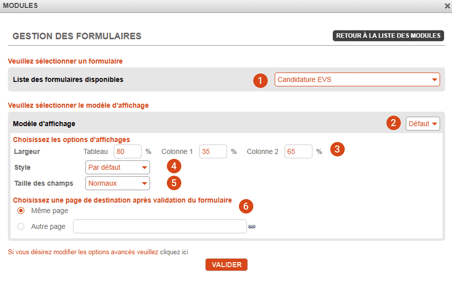 6. Page de destination, définir si l'internaute reste sur la même page après avoir remplit le formulaire et, si non, où il sera redirigé.