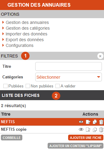 Publier / dépublier une fiche annuaire (respectivement quand l'oeil est ouvert / fermé)