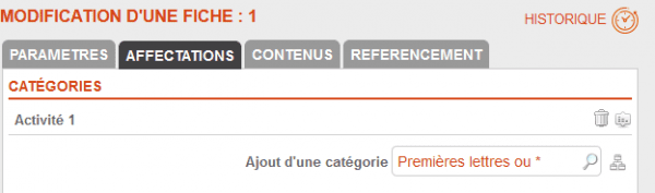 Quand vous éditer une fiche, vous obtenez cette interface avec plusieurs onglets, paramètres, affectation, contenus et référencementce sont les affichages de base les plus courante.