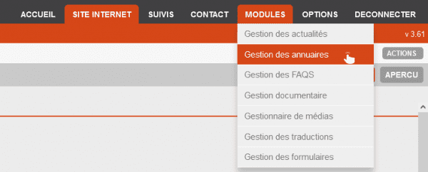 L'annuaire permet de concentrer sous forme de fiche toute coordonnées nécessaire (nom, prénom, téléphone, adresse...) et de les afficher sous forme de liste ou géolocalisés sur une carte.Pour l'utiliser il faut vous rendre dans "modules" puis dans "gestion des annuaires".