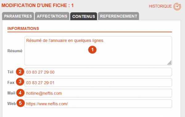 1. Résumé, remplir la description de la fiche qui ne s'affichera que lorque l'on ouvrira le détail de la fiche