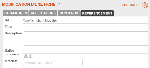 Cet onglet permet de paramétrer votre fiche déstiné au référencement, elle permet de donner les éléments d'affichage dans les moteurs de recherche avec un titre différent de la fiche, description différente ainsi que définir les mots clé qui caractérise cette fiche.