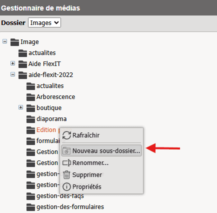 Pour se faire, cliquez sur le dossier dans lequel vous souhaitez ajouter un sous-dossier (si vous souhaitez placer un dossier à la racine de "Images", alors sélectionnez "Images").