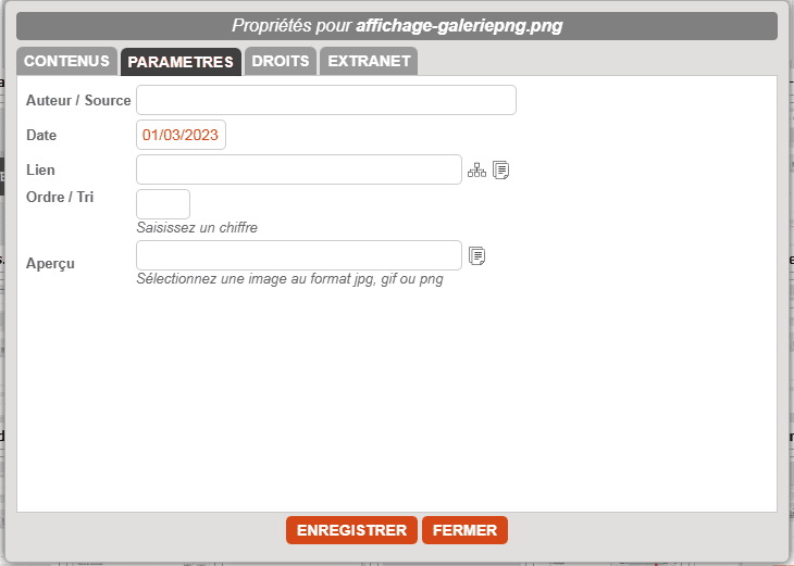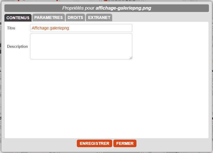 Une pop up s'ouvre par dessus le gestionnaire de médias. Elle comprend deux onglets.