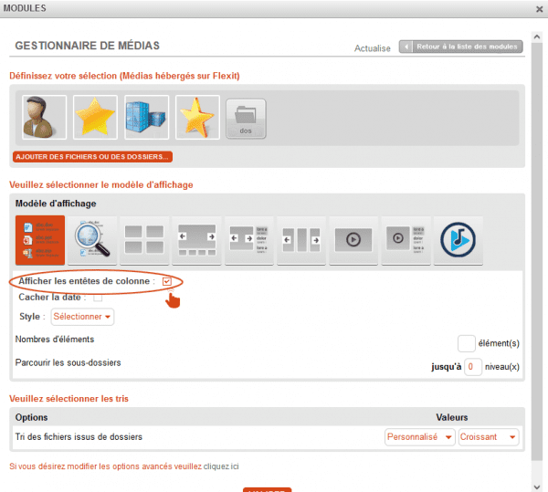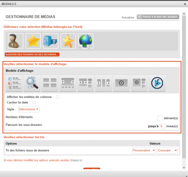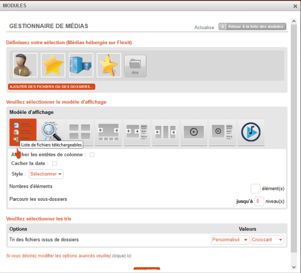 Vous avez la possibilité de choisir le nombre d'éléments que vous souhaitez afficher, ainsi que les différents niveaux de sous-dossiers (dans le cas ou vous avez sélectionné un dossier complet qui contient des sous-dossiers)