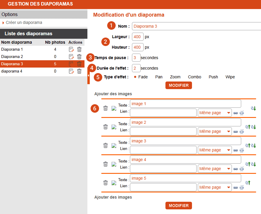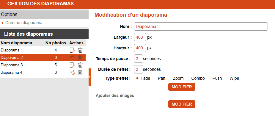 Redimensionner détermine le comportement du diaporama si celui-ci est insérée dans un espace trop restreint (forcer aux dimensions, tronquer l'image à partir d'un angle ou d'un côté, etc.)