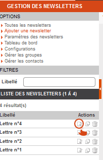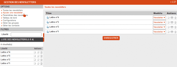 Lorsque vous voudrez rédiger ou envoyer une lettre d'information, la première étape à réaliser est de créer votre lettre.Pour ce faire, dans la colonne de gauche, boîte Options, cliquez sur Ajouter une newsletter,