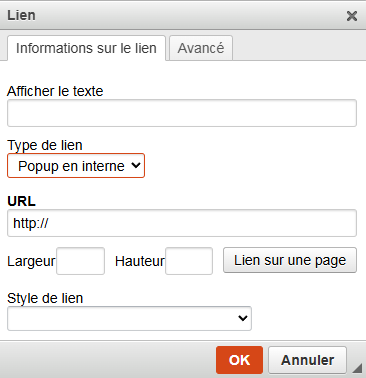 Une fois l'URL défini soit manuellement (pour un site externe), soit via le bouton "Lien sur une page" (pour une page de votre site), vous pouvez préciser la largeur et la hauteur de la popup (pas obligatoire, mais conseillé).