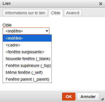 - : Fenêtre supérieure (_top), Même fenêtre (_self) et Fenêtre mère (_parent) ne sont plus utilisés, sauf dans des cas très précis (frames)