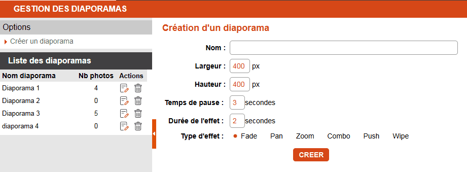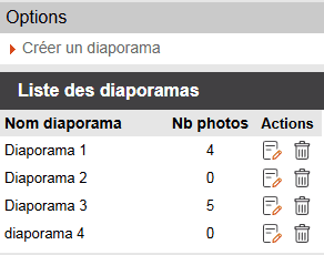 Cette boite liste les diaporamas en affichant leur nom et le nombre de photos qu'ils contiennent.