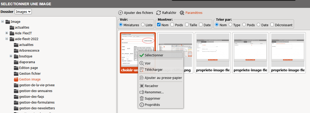 Vous pouvez organiser une gestion des images sur le serveur, en créant une arborescence de dossiers.