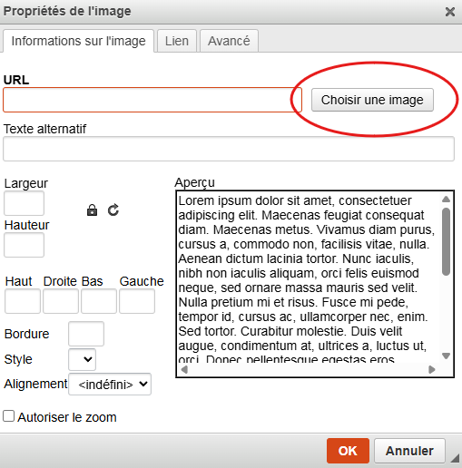 En cliquant sur sélectionner cela permet d'afficher les propriétés de l'image et de l'insérer dans la page.