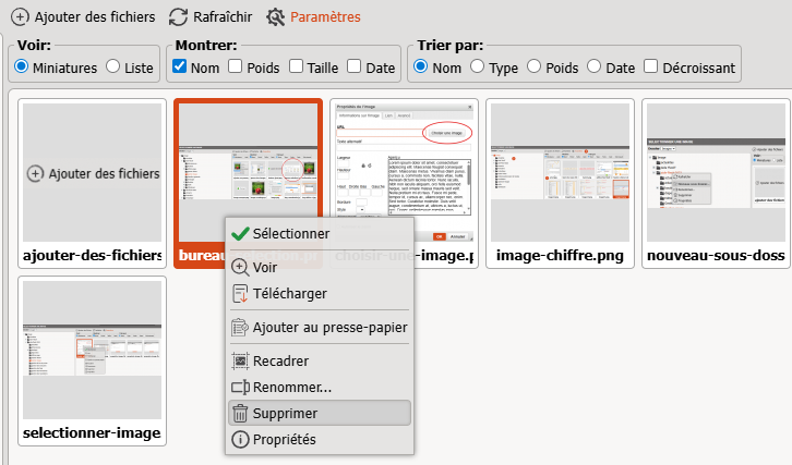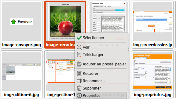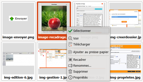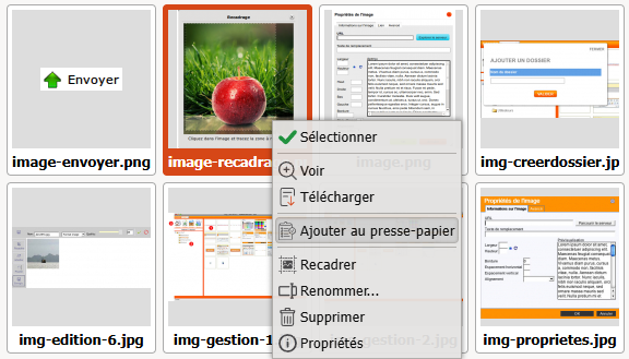 Si l'image que vous souhaitez insérer est déjà présente sur le serveur, passez votre curseur sur sa vignette, faites un clic droit et cliquez sur