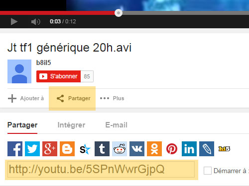 Vous pouvez aussi utiliser les URLs courtes. Dans la même page Youtube, cliquez sur le lien Partager, puis copier le lien.