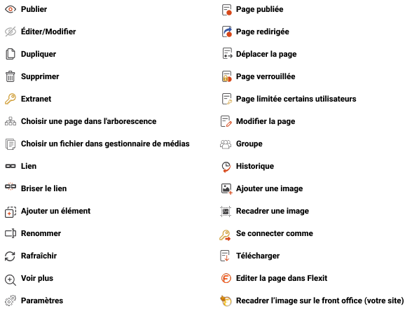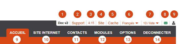 - Modules : gestion des modules installés sur votre site (actualités, diaporama, FAQ, etc.). N'apparaît pas si le site ne comprend aucun module.