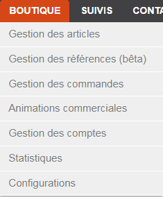 Voici la liste des différents onglets disponibles dans le module boutique :
