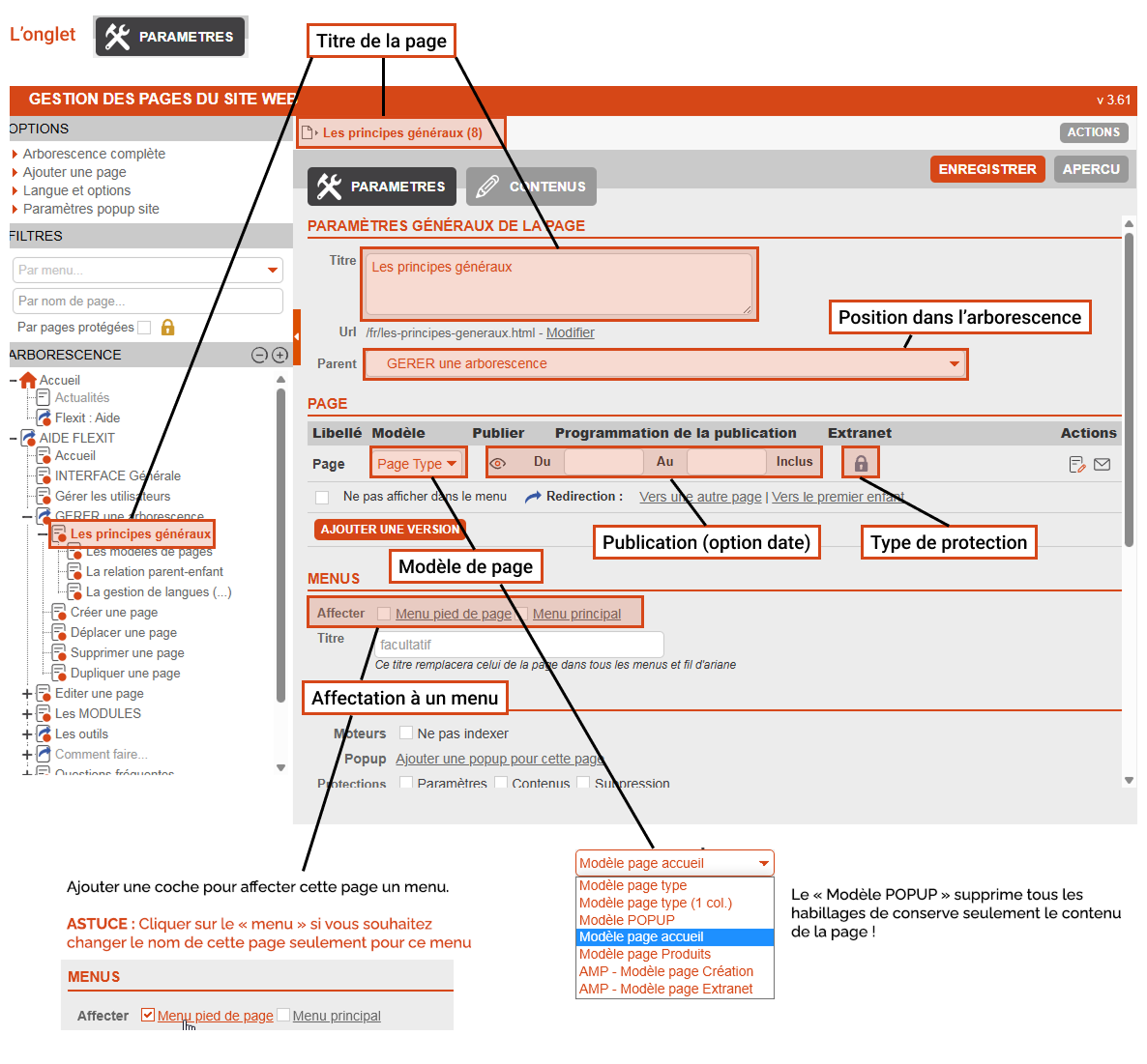 - Modèle de page utilisé : permet éventuellement d'en changer (attention à la perte éventuelle de contenu pour une page existante)