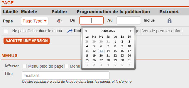 Pour définir une période de publication, il suffit de cliquer dans les champs "Du" (début de la publication) ou "Au" (arrêt de la publication) :