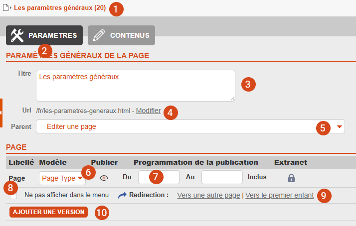 en haut de la page (sinon les modifications ne sont pas enregistrées).Selon la configuration de votre site, vous pouvez également avoir d'autres éléments de paramètrages d'une page :