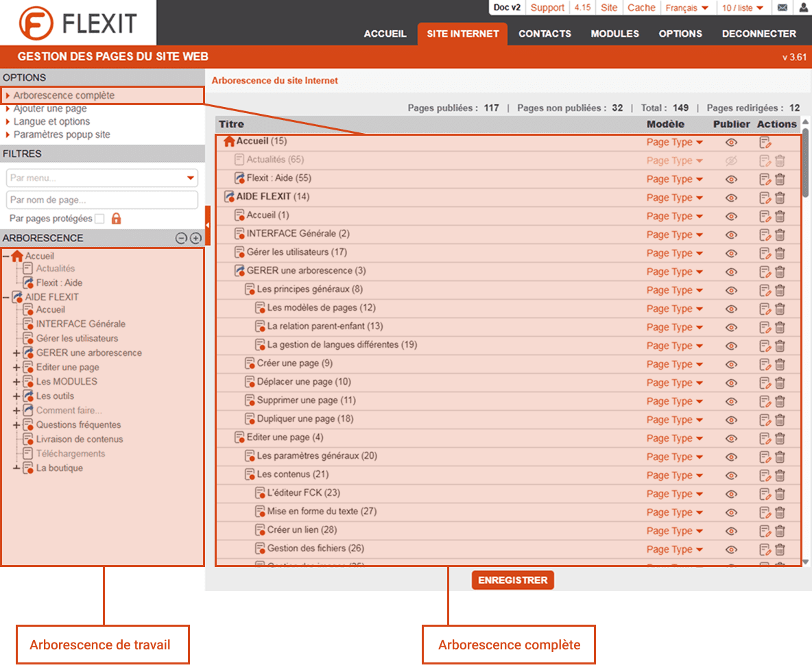 En cliquant sur "Arborescence complète" dans le menu Options, on retrouve la synthèse des pages existantes :