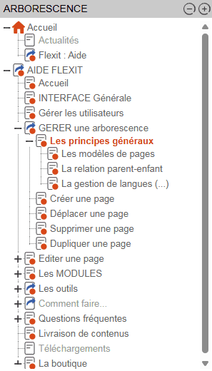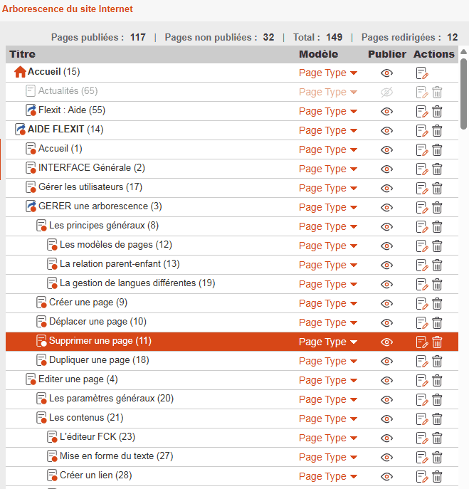 - Informations complémentaires selon l'icône (Publiée ou non, redirection, extranet,...)