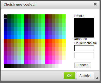 Vous pouvez choisir une couleur parmi les 216 couleurs communes ou encore saisir les codes colorimétriques hexadécimaux de la couleur que vous désirez (ici, #3344EE).