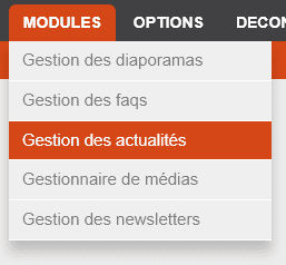 Après avoir cliqué sur "Gestion des actualités" dans le menu déroulant de l'onglet "Modules", vous aurez accès à l'interface principale de gestion de vos actualités.