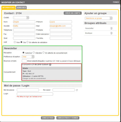 Une fois que le client a cliqué sur "Je consens à recevoir vos lettres d'information", vous pourrez retrouver ses données de consentement sur sa fiche contact. Ce sont ces données qui font foi pour être en accord avec la réglementation.