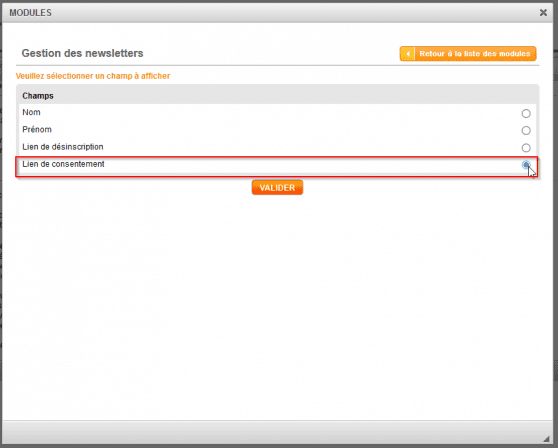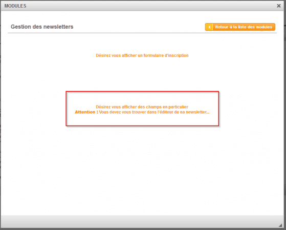 Intégrez ensuite le module newsletter dans l'éditeur (voir comment intégrer un module dans l'éditeur)